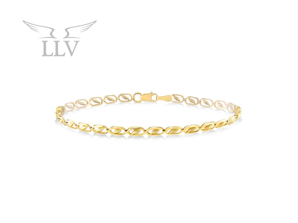 Originální zlatý náramek o délce 18 cm je tvořen oválnými články, které jsou uvnitř doplněné ozdobou ve tvaru jemné vlnky. Náramek je vyrobený ze žlutého 14kt zlata s lesklým povrchem, který vyzařuje hřejivé odlesky. Zapínání zajistí karabinka, která nijak nenaruší jeho vzhled.