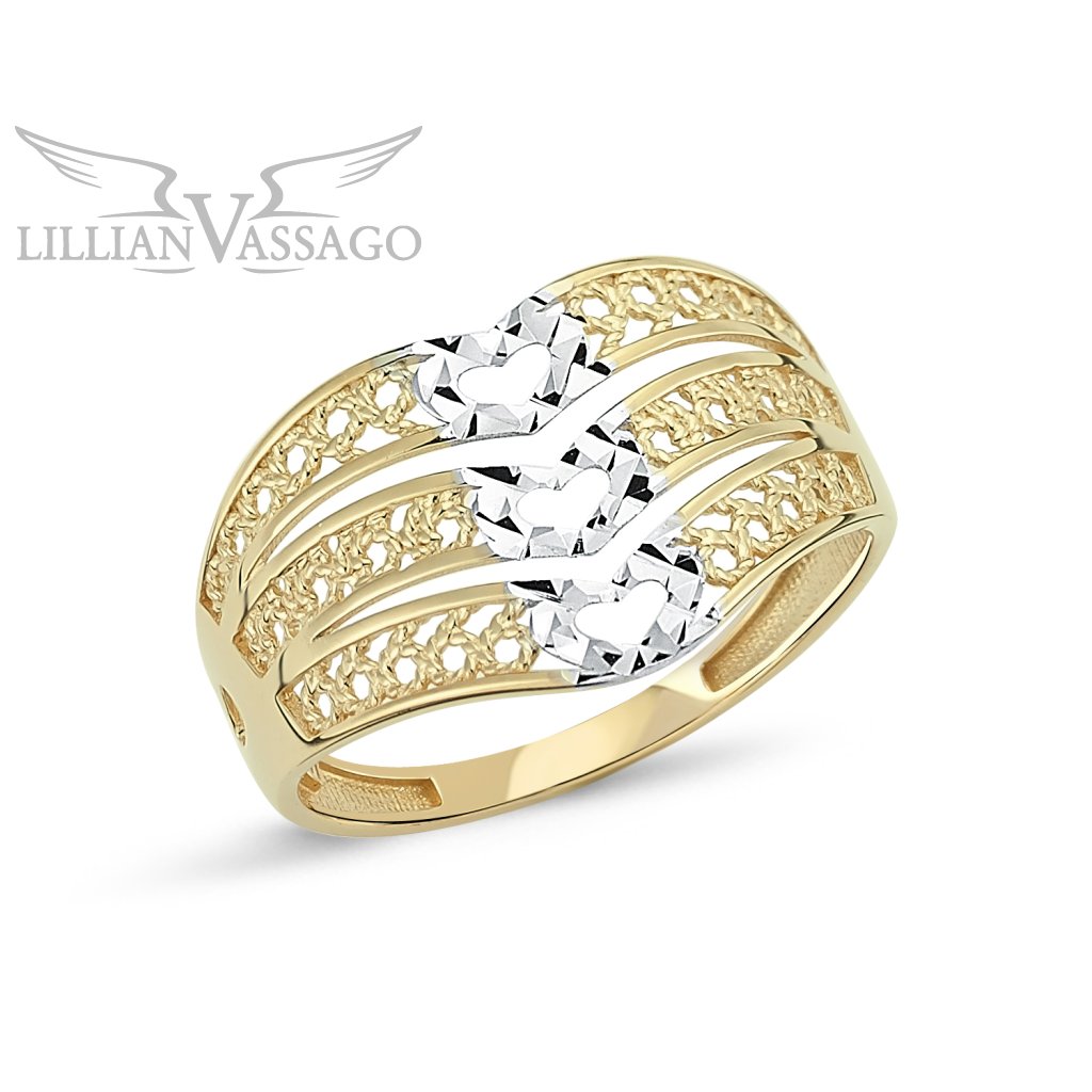 Designově nápaditý prsten zhotovený v moderní kombinaci bílého a žlutého 14kt zlata, díky níž se prsten lehce kombinuje s ostatními doplňky – vždy spolu budou dokonale ladit. Výrazný zlatý prsten je dekorován originálním prořezáváním, srdíčky a lesklou povrchovou úpravou, díky které se prstýnek bude na ruce vyjímat.