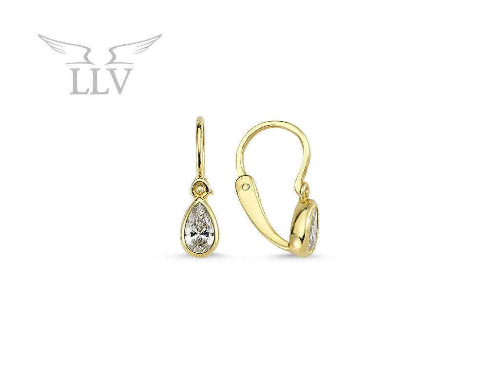 Dětské náušnice ze žlutého 14 kt zlata, zapínání je řešeno typem brizura. Dominantou těchto náušnic je bílý zirkon ve tvaru kapky, který krásně odráží sluneční paprsky a vytváří tak velmi blyštivý a zářivý efekt. Pokud pro svou holčičku hledáte šperk, který působí elegantně a noblesně, jsou pro ni tyto náušnice jako stvořené!