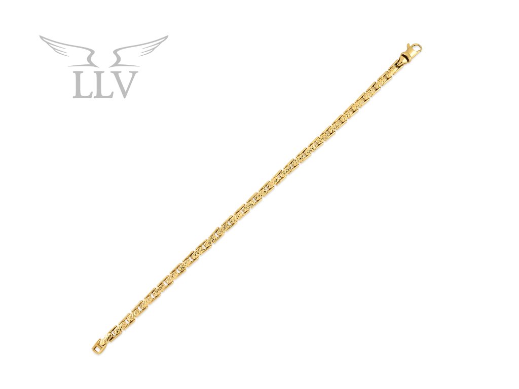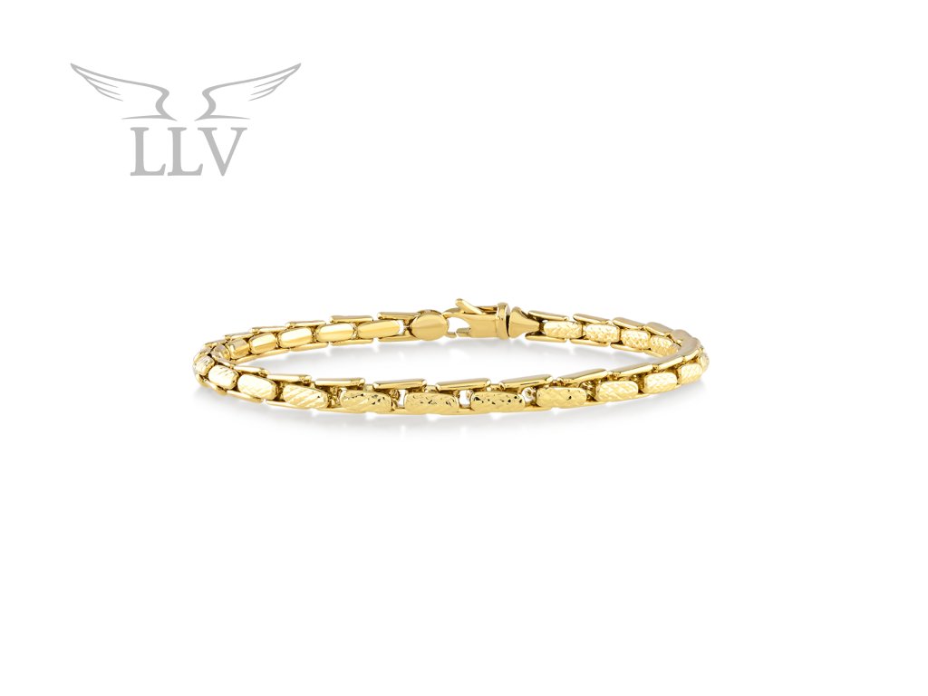 Zlatý unisex náramek ocení dámy i pánové, kteří si potrpí na unikátní šperky s nádechem elegance! Článkový náramek o délce 19 cm je vyrobený ze žlutého 14kt zlata s lesklým povrchem. Články jsou vzájemně propojené tak, že vytváří čtyřhranný řetízek. Jelikož jsou částečně hladké a polovina jich je zdobena gravírem, každá strana náramku je jiná - střídavě hladká a zdobená.