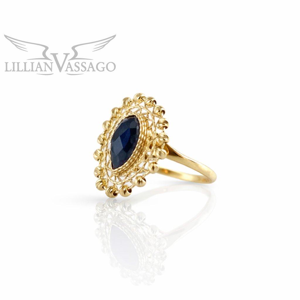 Safír je zasazen do bohatě zdobeného zlatého rámu s gravírovanými detaily a plastickými prvky, které vytvářejí dojem jemné krajky. Tato propracovaná kompozice dodává prstenu nejen na luxusu, ale i na jedinečnosti – působí jako umělecké dílo.