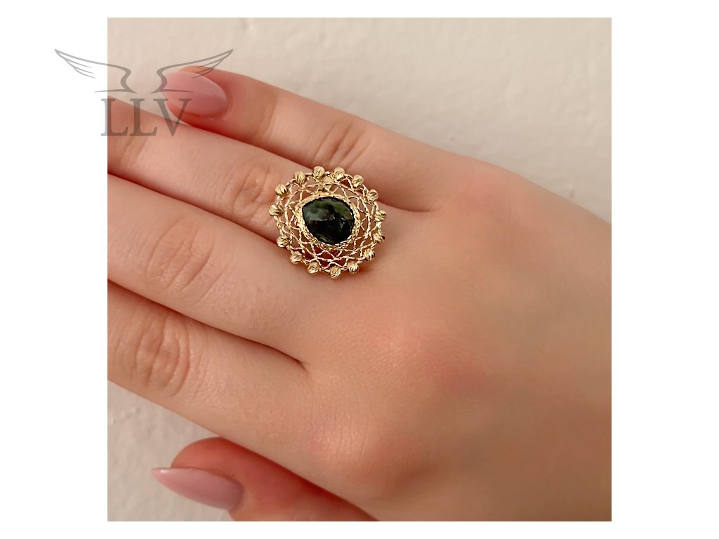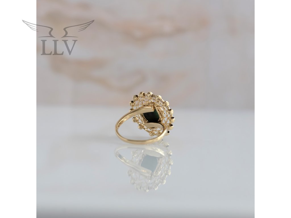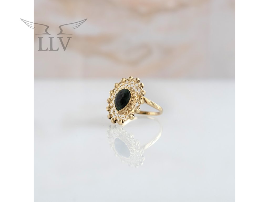 Exkluzivní zlatý prsten ze žlutého 14kt zlata v sobě spojuje jemnou zlatnickou práci s krásou přírodního smaragdu. Dominantou šperku je výrazný smaragd ve tvaru kapky, jehož sytě zelený odstín působí svěže, harmonicky a přitahuje pozornost svou přirozenou hloubkou. Kámen je zasazen do bohatě zdobeného rámu z gravírovaného zlata, který připomíná krajkový vzor. Jemné reliéfní detaily po obvodu umocňují noblesní charakter šperku a dodávají mu půvab starobylé elegance.