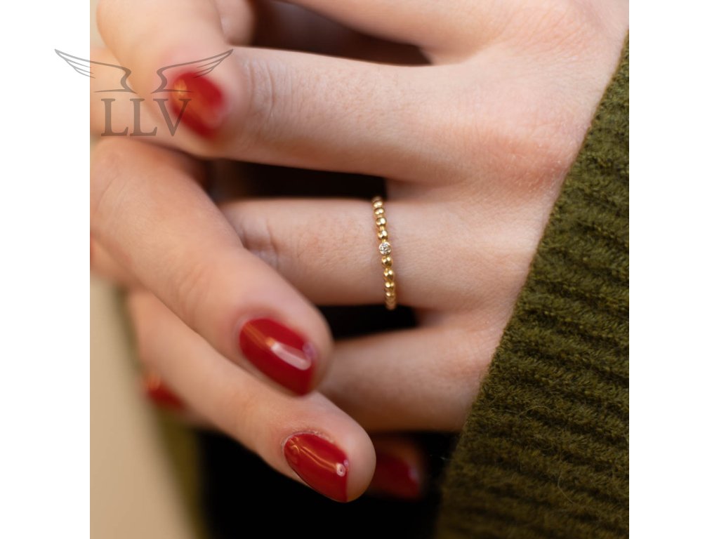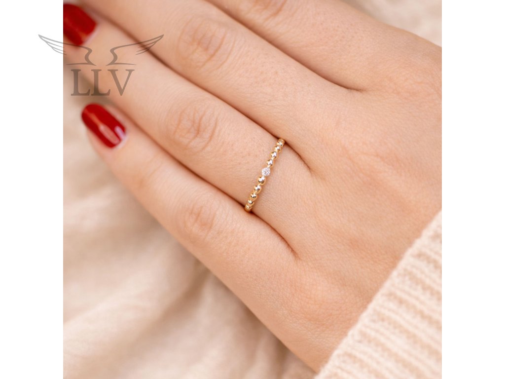 Lesklý prsten ze 14kt zlata zdobený zirkonem a jemným motivem půlkuliček je šperkem, který si vás získá svou hravostí i elegancí. Drobné kulaté detaily vytvářejí po obvodu prstenu jemnou texturu, která krásně zachytává světlo a dodává šperku živý, třpytivý efekt.