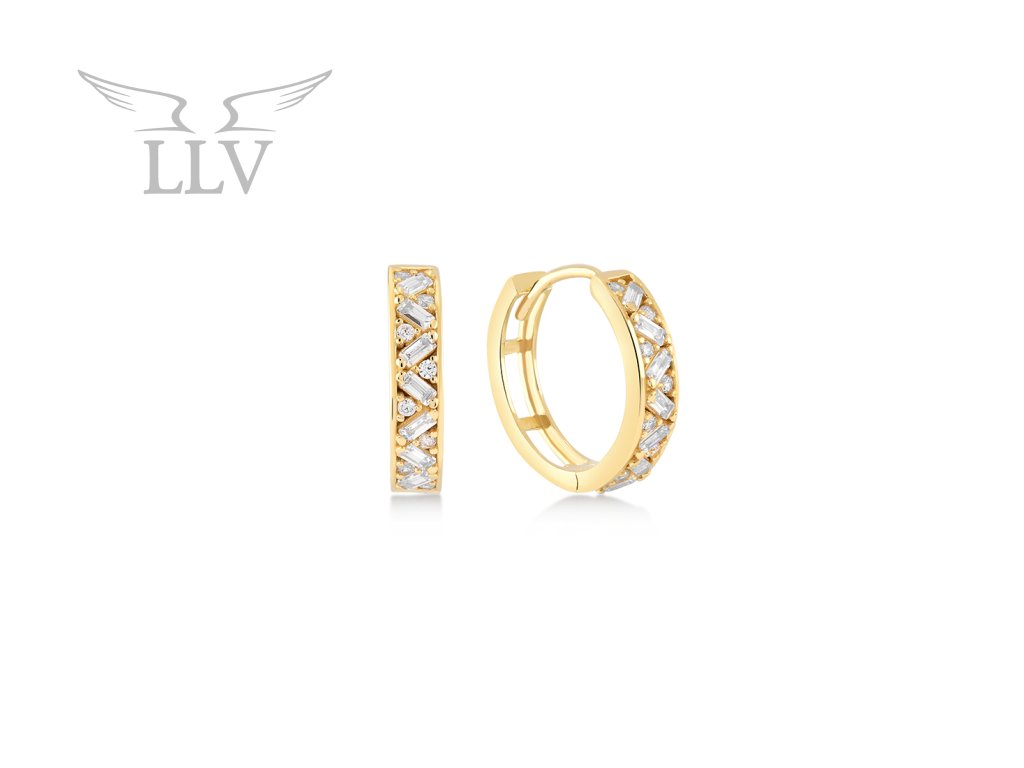 Třpytivé kroužkové náušnice se zapínáním typu cvakačky, tedy na zaklapnutí do drážky, jsou vyrobené ze žlutého 14kt zlata s hladkým povrchem ve vysokém lesku. Přední část kruhu je zdobená čirými zirkony vybroušenými do tvaru obdélníku, prokládanými drobnějšími kulatými zirkony. Všechny kameny jsou bezpečně zasazené do krapen.