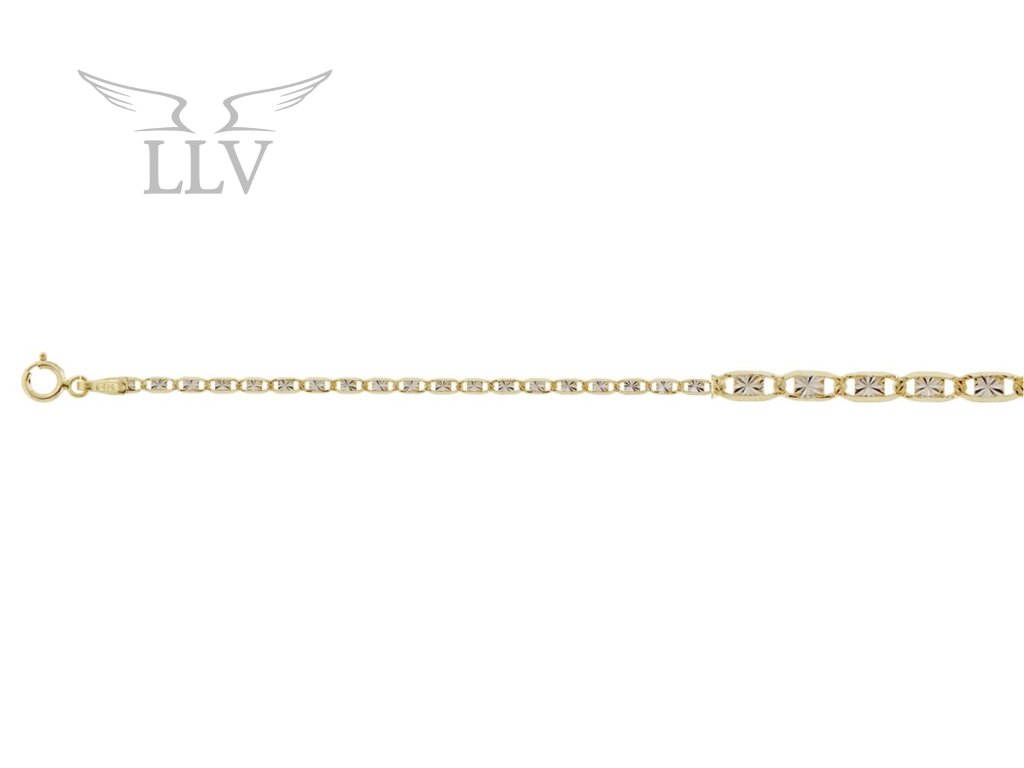 Zlatý 14kt náramek typu Valentino v kombinovaném provedení je elegantním šperkem, který spojuje žluté a bílé zlato v harmonickém kontrastu. Charakteristické články se střídají v dynamickém rytmu a jejich precizní diamantový výbrus dodává náramku oslnivý třpyt, jenž vynikne při každém pohybu.