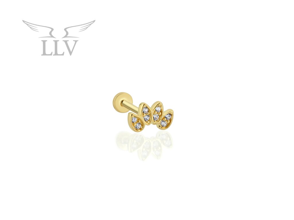 Představujeme Vám zářivý šperk, který si zamilujete na první pohled! Zlatý piercing okouzlí osmi čirými zirkony zasazenými do krapen ve čtyřech elegantních kapkovitých lístcích. Hravý design připomíná rozkvetlou květinu i jiskřivou korunku, dodá Vašemu outfitu jemný nádech luxusu i originality.