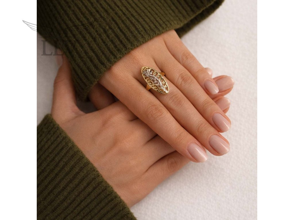 Luxusní prsten z kombinovaného 14kt zlata zaujme svým výrazným a přesto vzdušným oválným designem a precizním zpracováním detailů. Ozdoba je tvořena jemně gravírovanou květinou z bílého zlata, jejíž plastické linie nádherně vynikají na pozadí žlutého zlata. Kontrast obou odstínů dodává šperku hloubku, eleganci a nadčasový charakter.