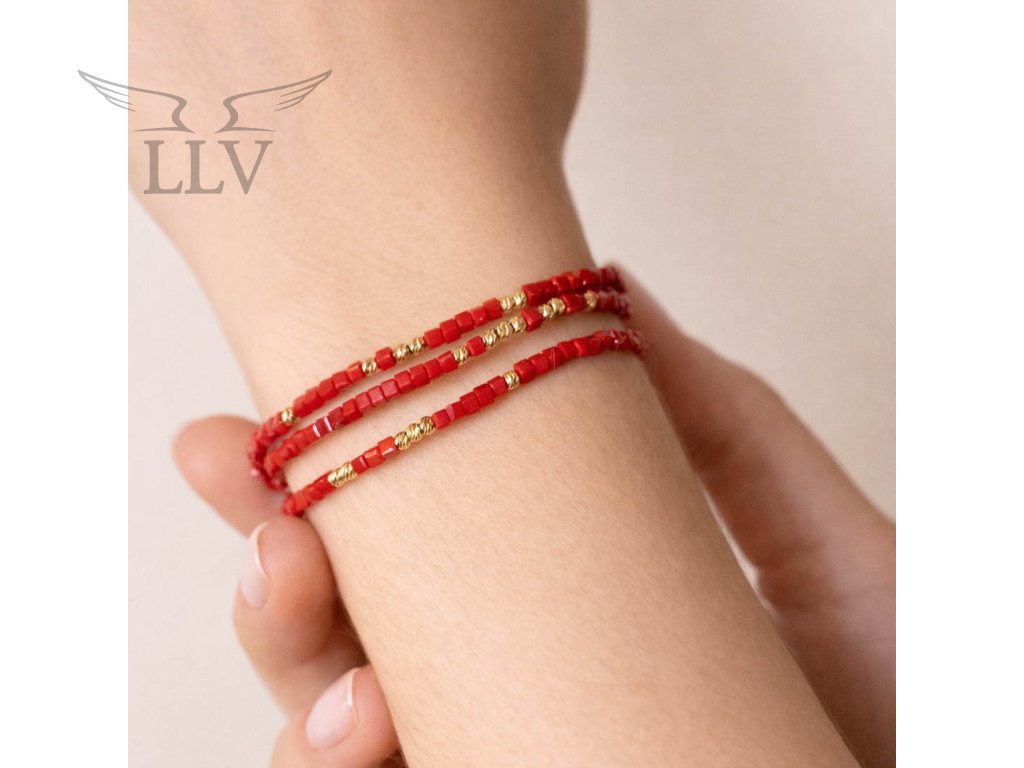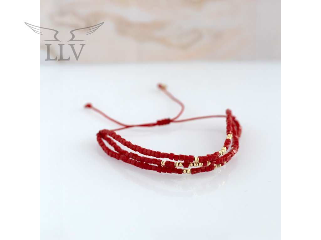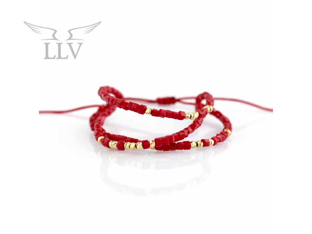Úchvatný trojitý šňůrkový náramek s křišťály v romantické červené barvě a zlatými kuličkami. Kuličky jsou zhotovené z nadčasového 14kt zlata a jsou ozdobeny jemným gravírem. Díky tomuto detailu je náramek naprosto jedinečný a stylový. Variabilní nastavení délky zajistí, že náramek perfektně padne na každou ruku. Dokonalý šperk pro každou moderní ženu i dívku.