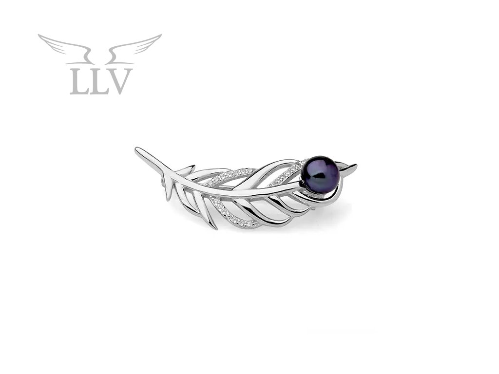 Stříbrná brož pírko zdobené perlou a zirkony LLVY-SBR003