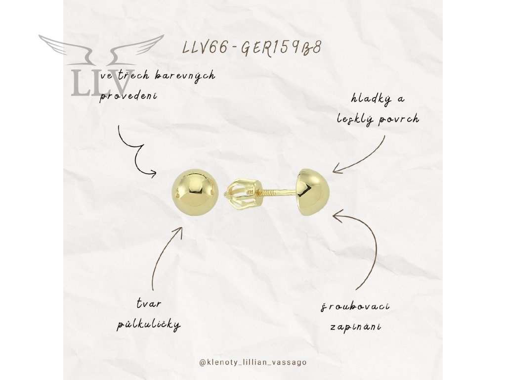 Celozlaté náušnice ze 14kt zlata ve tvaru malých půlkuliček ve vysokém lesku. Je to naprostá klasika (tzv. pecky) ve světě náušnic, která bude slušet každé ženě i dívce a lze je použít jako náušnici do druhé dírky. Oblíbené zapínání na šroubek, použité u těchto náušnic je velmi praktické a bezpečné.