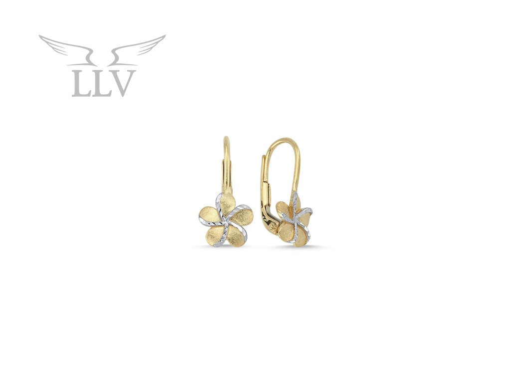 Jemné náušnice z kombinovaného 14kt zlata ve tvaru kytičky v dokonalém matu, zdobené detailně gravírovaným bílým zlatem.  Náušnice jsou drobné a decentní, přesto Váš obličej dokonale rozzáří. Originální vzor, který potěší každou holčičku i slečnu.