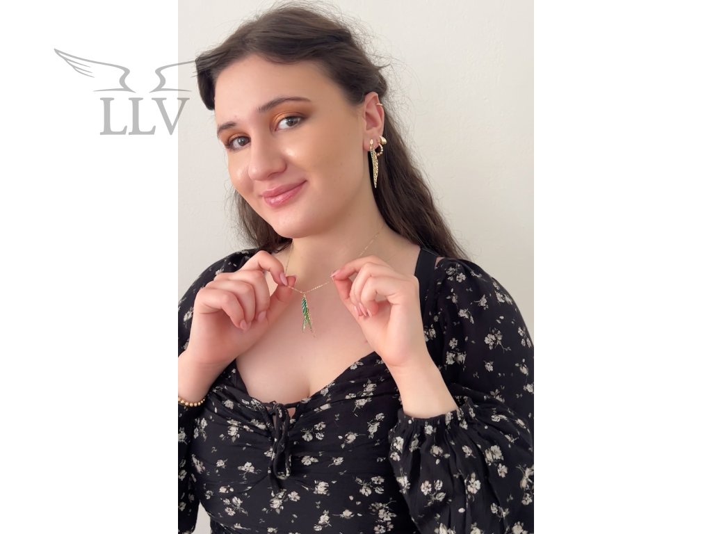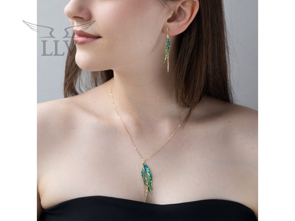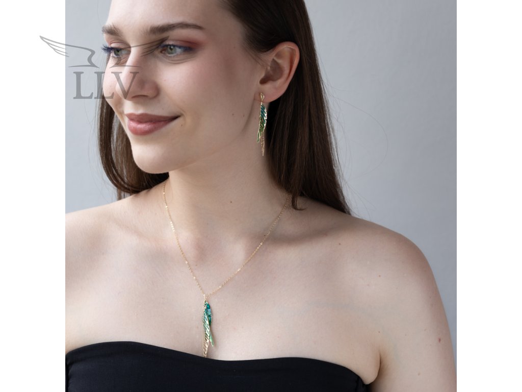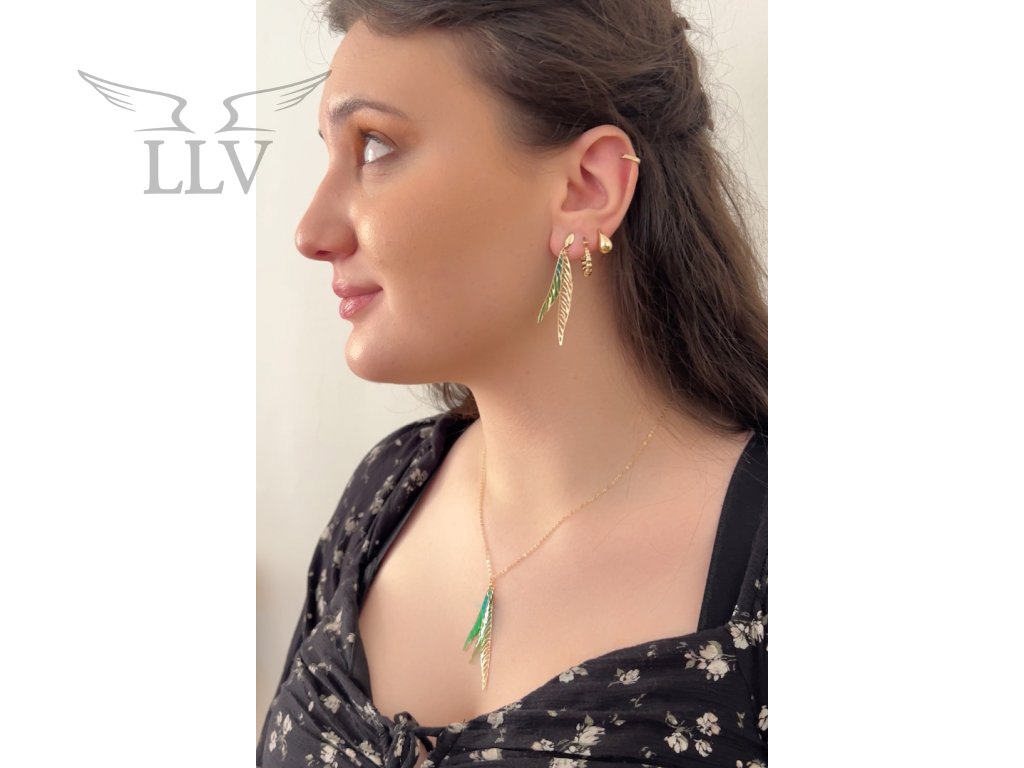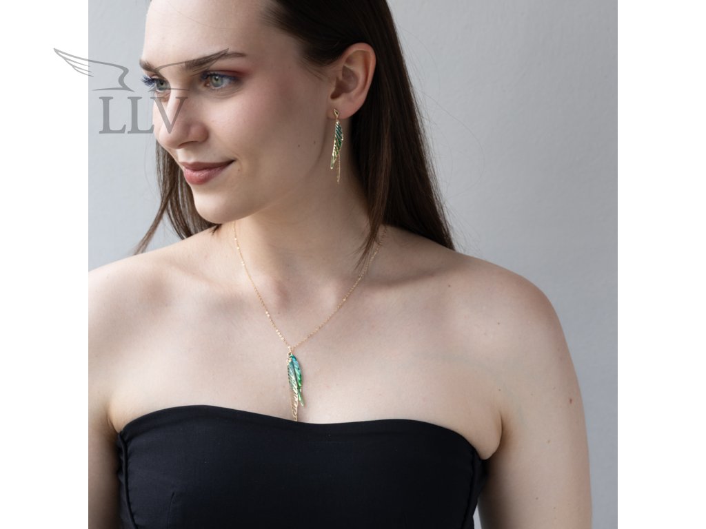Hlavním prvkem šperku jsou tři volně se pohupující pírka – jedno jemné a vzdušné, celozlaté, s precizně propracovanými výřezy a gravírováním, což mu dodává něžný charakter. Další dvě pírka jsou zdobená zeleným smaltem, jehož sytá barva krásně kontrastuje s teplým tónem zlata a přináší do designu hravý, svěží prvek.