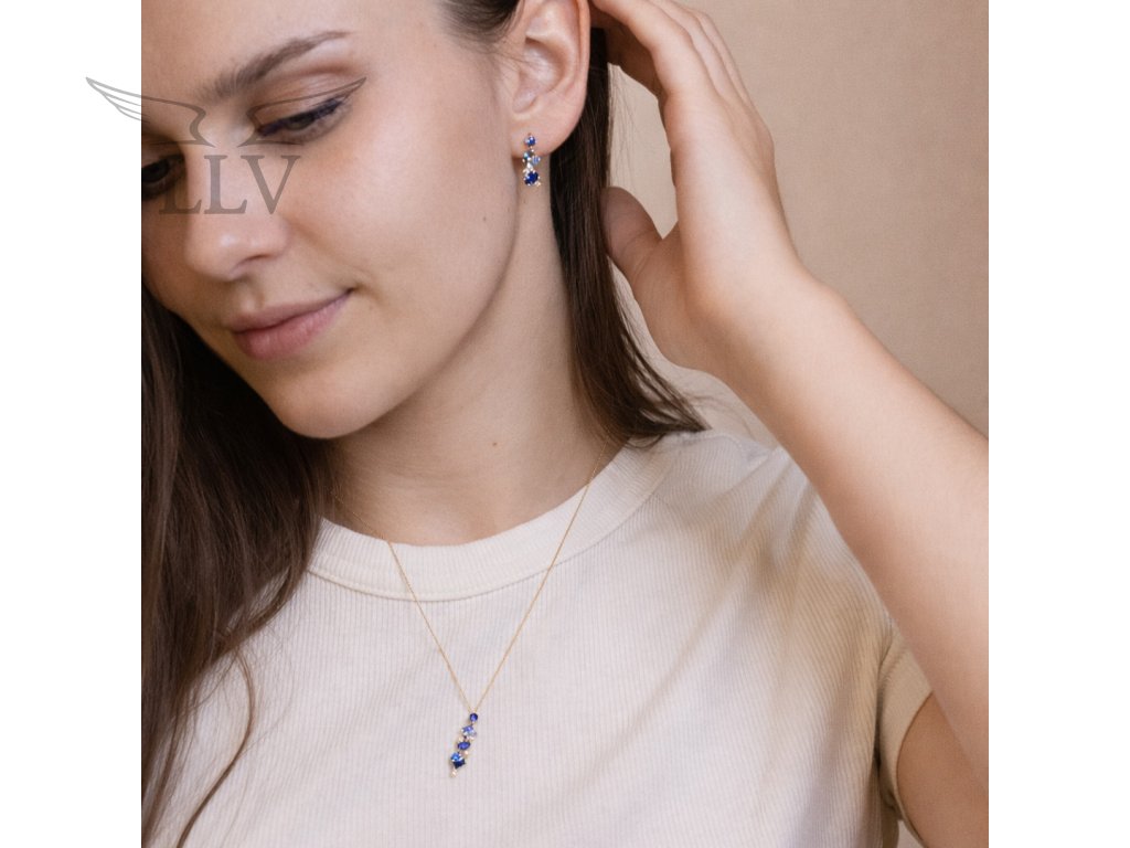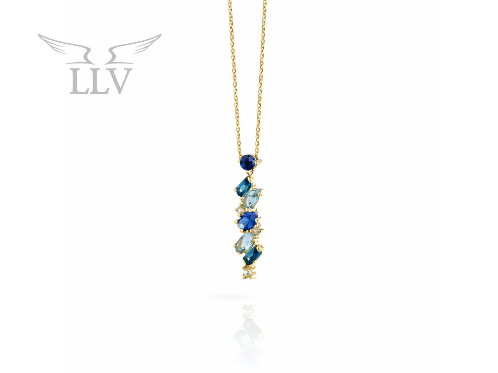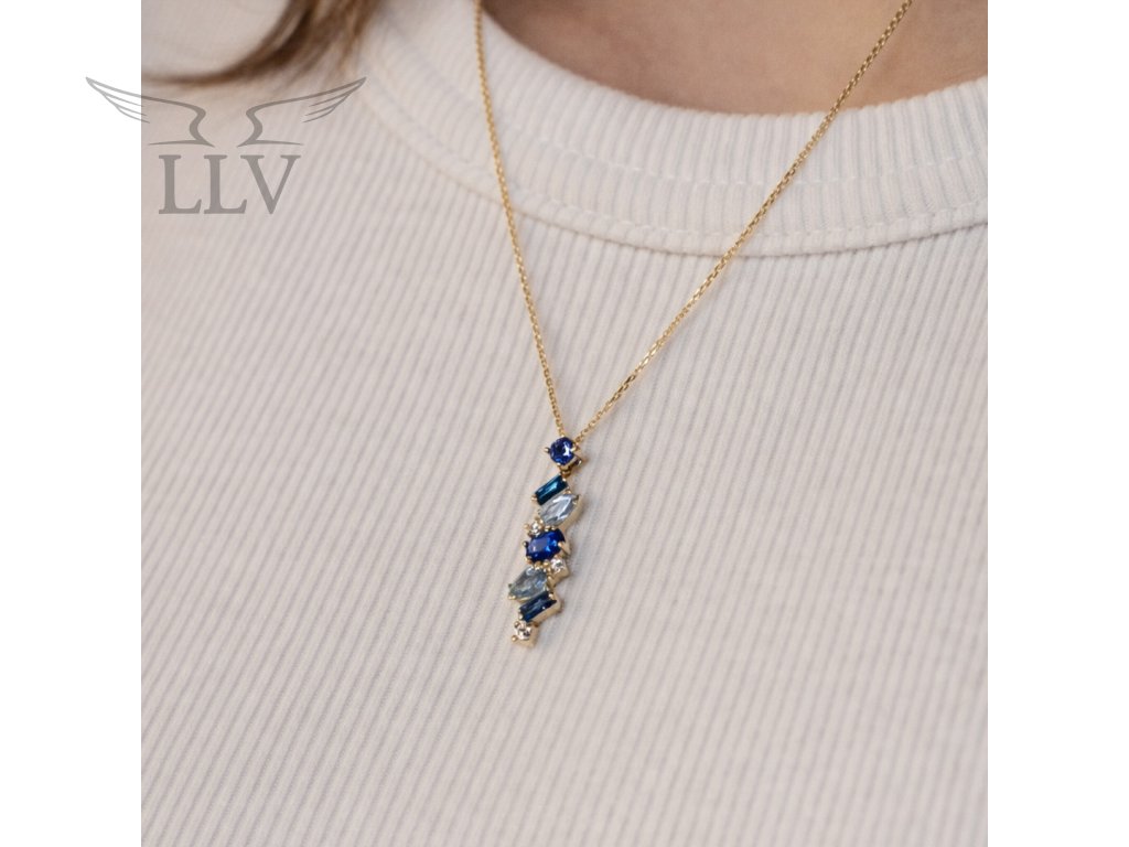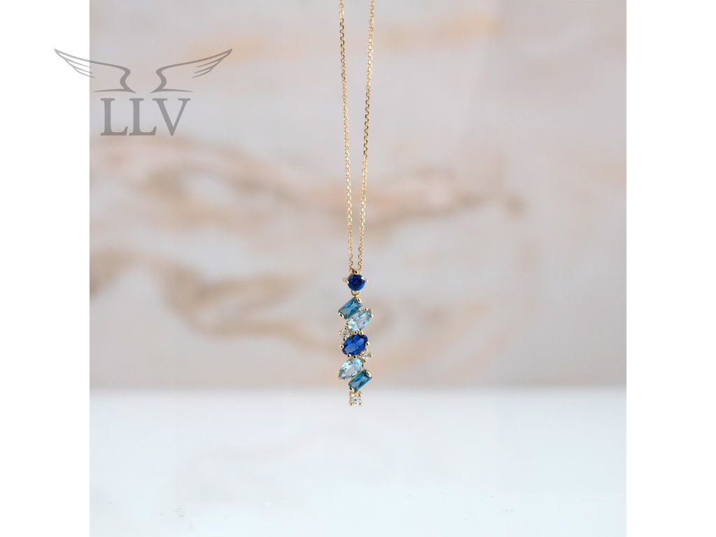 Něžný náhrdelník ze žlutého 14kt zlata si Vás získá svou elegancí a oslnivou hrou barev. Je tvořený velice jemným zlatým řetízkem s nastavitelnou délkou 42 cm + 3 cm, který nechává plně vyniknout podlouhlou ozdobu – čiré i modré zirkony a přírodní topazy. Kombinace chladivě modrých tónů a jiskřivé čistoty vytváří šperk, který působí svěže, moderně a přitom nesmírně žensky. Různorodé tvary kamenů zasazených do krapen dodávají náhrdelníku hravý a originální charakter. Každý z nich odráží světlo po svém a doslova Vás rozzáří při každém pohybu.