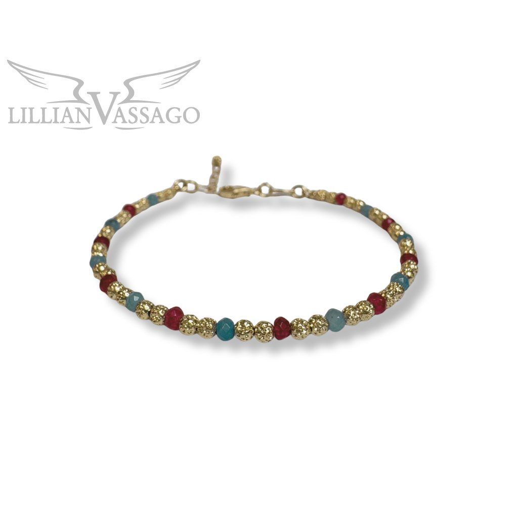 Zlatý náramek se zlatými kuličkami, rubíny a aquamaríny LLV22-GB073