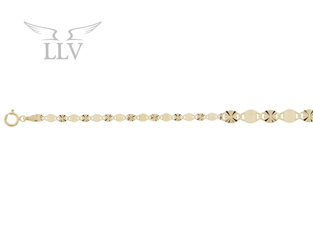 Zlatý 14kt náramek typu Valentino je výrazným a zároveň elegantním šperkem, který zaujme svým charakteristickým vzorem plochých, střídavě broušených a hladkých článků. Precizní diamantový výbrus dodává náramku oslnivý třpyt, díky němuž se krásně rozzáří při každém pohybu ruky.