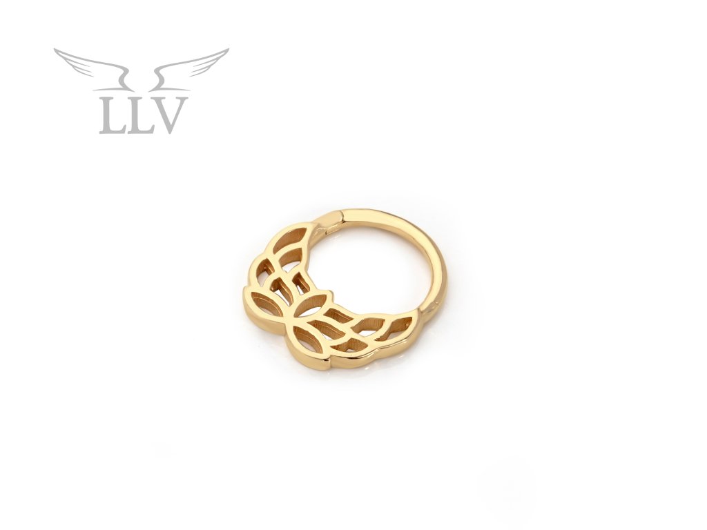 Zlatý piercing kroužek s motivem lístků vyniká jemným rostlinným designem, který působí elegantně a zároveň svěže. Otevřená struktura lístků dodává šperku vzdušnost a lehkost, zatímco lesklý povrch podtrhuje teplý odstín žlutého 14karátového zlata.