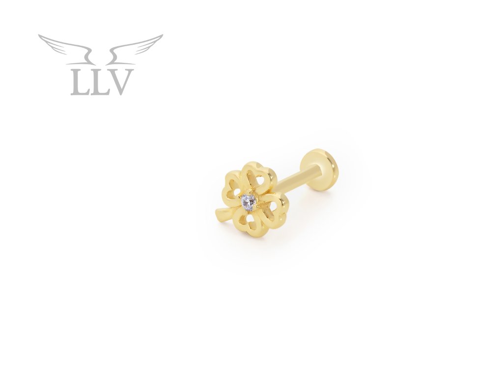 Zlatý piercing labreta čtyřlístek zdobený zirkonem LLV92-GPI061LB