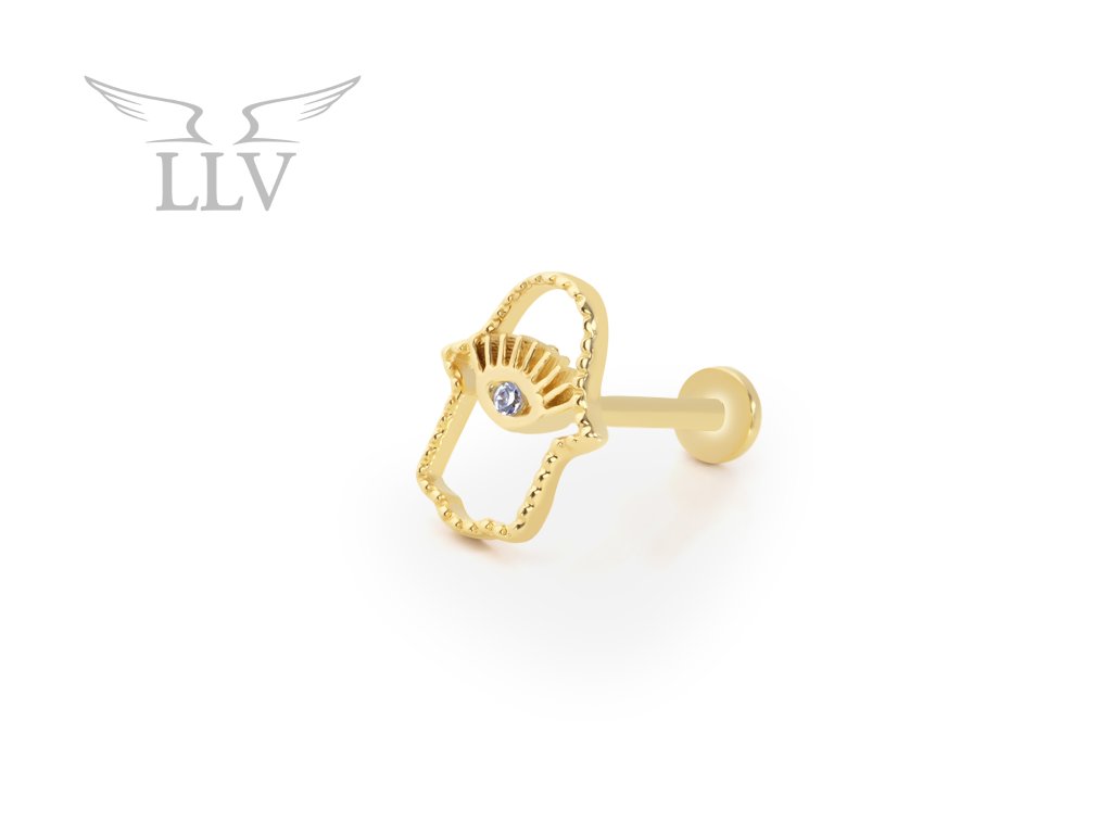 Zlatý piercing labreta fatimina ruka zdobená okem se zirkonem LLV92-GPI060LB