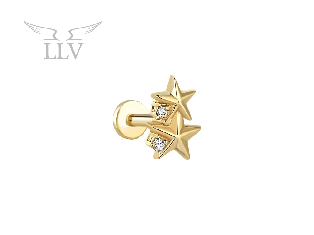 Pokud Vás fascinuje záře noční oblohy, zaujme Vás právě tento šperk. Zlatý piercing ve tvaru dvou plastických hvězd zaujme svým jemně hravým a zároveň elegantním vzhledem. Každou hvězdu zdobí po straně jeden čirý zirkon zasazený do krapen, který se třpytí jako skutečná hvězda na nebi. Lesklé, hladké zlato dodává šperku luxusní nádech.