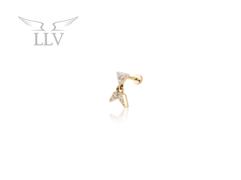 Třpytivý dotek hlubin. Tento elegantní piercing typu labreta ze 14kt žlutého zlata připomíná lesklou ploutev — symbol volnosti, ladnosti a propojení s přírodou. Dva drobné prvky zdobené zirkony vytvářejí jemný pohyb a lehkost, která působí živě a hravě.