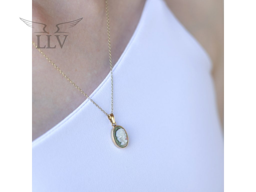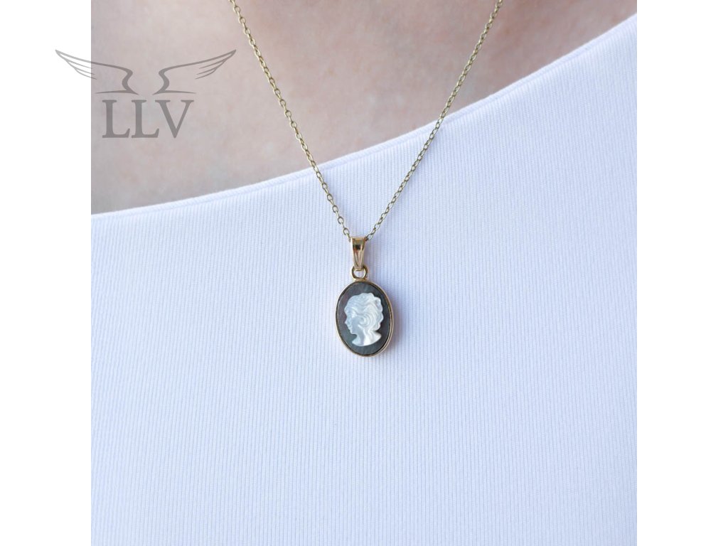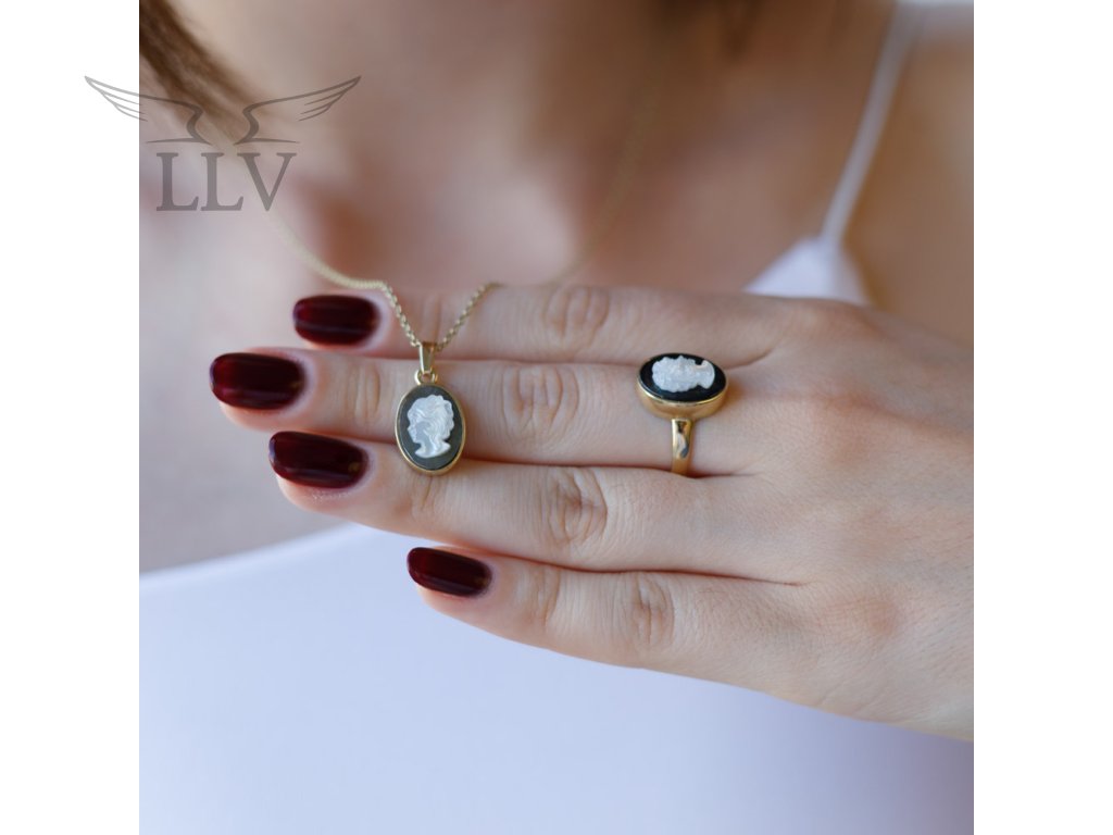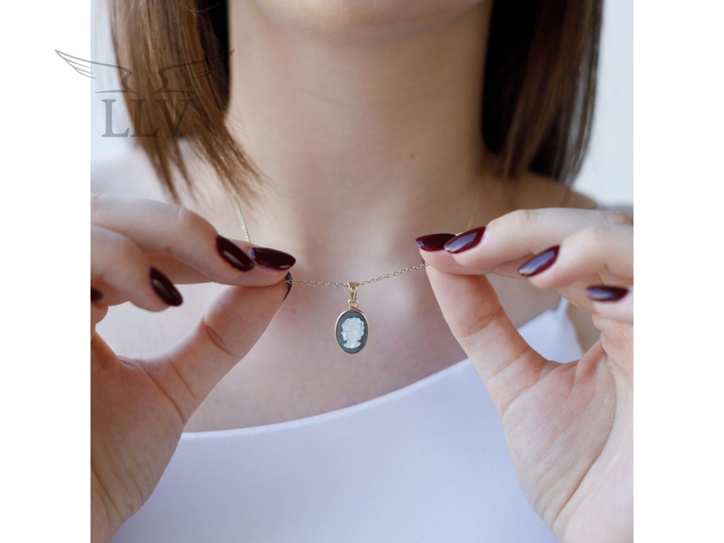 Nadčasová elegance s nádechem historie. Zlatý přívěsek ze žlutého 14kt zlata nese klasickou kamej s ženským profilem, precizně vyřezanou do přírodního achátu. Jemné barevné vrstvy kamene vytvářejí výrazný kontrast a dávají vyniknout každému detailu reliéfu.