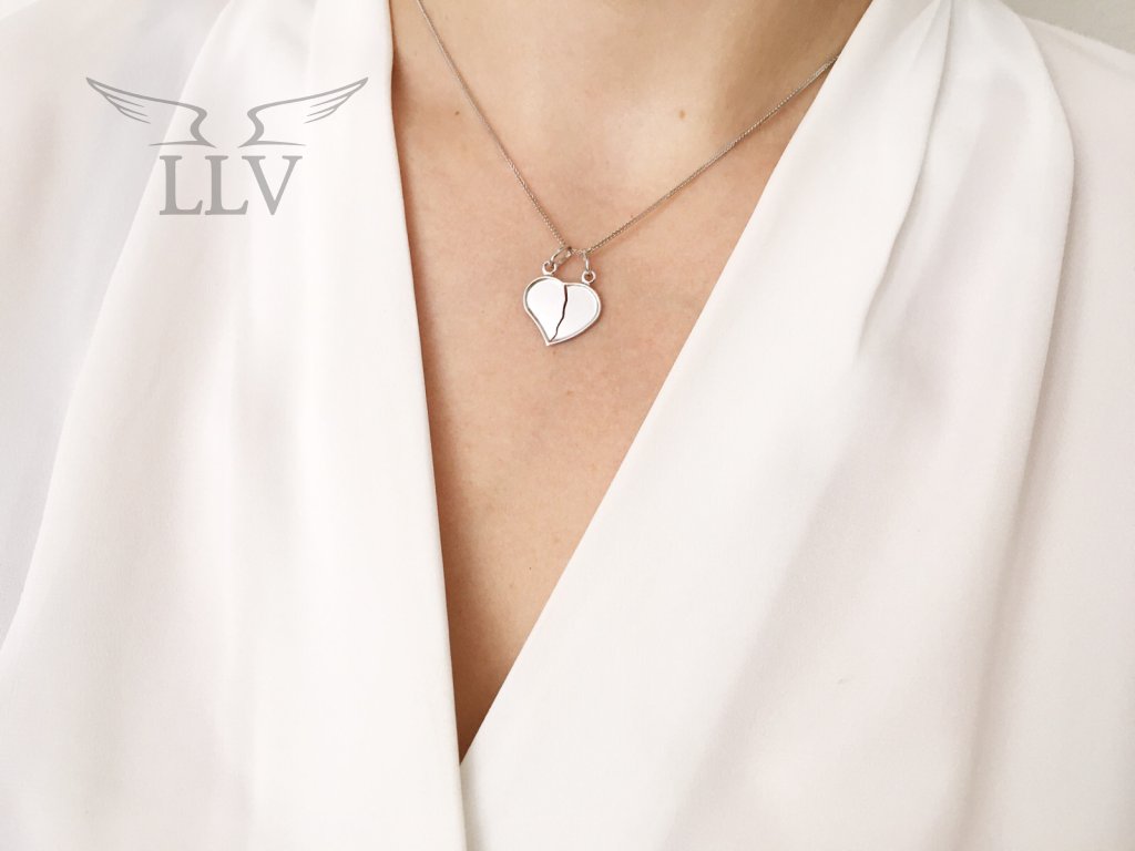 Originální přívěsek ve tvaru srdce je vyrobený z bílého 14kt zlata ve vysokém lesku. Přívěsek je složen ze dvou částí a každá má své závěsné očko. Toto srdíčko je ideálním dárkem pro zamilované nebo pro dobré kamarádky, jelikož se jednoduše rozlomí na dvě části a každý má jednu polovinu.