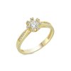 Jedinečný zásnubní prsten v 14kt zlatě. Hlava prstenu je tvořena centrálním zirkonem zasazeným v sedmi větších krapnách, které jsou navíc doplněné menšími zirkony. V obroučce jsou vsazeny kameny do hladka. Díky velkému množství třpytivých zirkonů je tento prsten doslova nepřehlédnutelný na ruce. Unikátní šperk, který jistě udělá radost každé ženě a je vhodný i jako dárek k výročí, narozeninám, svátku nebo čistě jen tak pro radost.