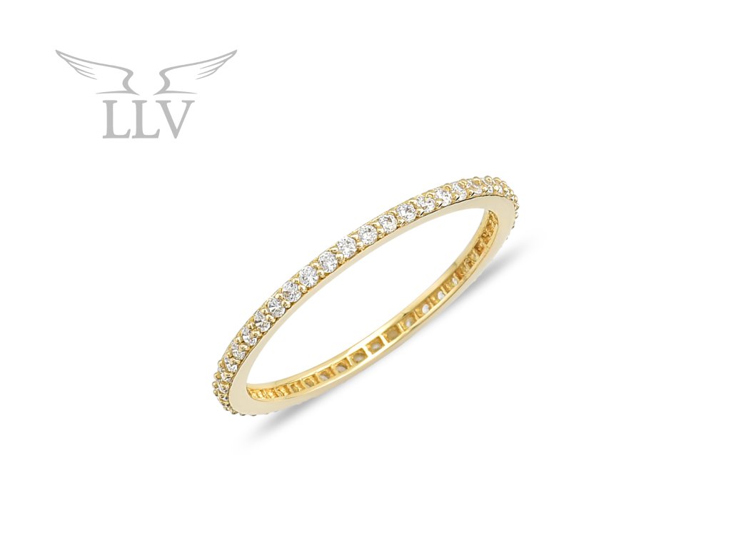 Jemný prsten ve žlutém 14kt zlatě zdobený zářivými zirkony čiré barvy, které jsou posázené po celém obvodu. Povrch prstenu je hladký v lesklé povrchové úpravě a kameny jsou uchycené v malých krapnách tzv. "zrnkách". Výhodou je možnost kombinace se zásnubním prstenem. Jemný a minimalistický model, který jistě vykouzlí úsměv na tváři každé ženě i slečně.