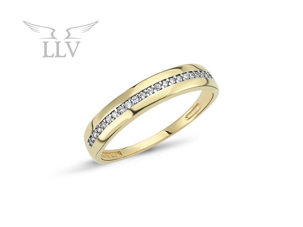 Moderní prsten ve žlutém 14kt zlatě zdobený zářivými zirkony. Povrch prstenu je hladký v lesklé povrchové úpravě s čirými zirkony, které jsou zasazené do jedné řady a uchycené v malých krapnách tzv. "zrnkách". Prsten má moderní vzhled, který bude slušet opravdu každému. Šperk je vhodný jako dárek k výročí, narozeninám, svátku nebo čistě jen tak pro radost.