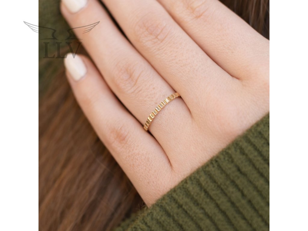 Lesklý prsten s jemným prořezáváním ze 14kt zlata je elegantní drobností, která přitahuje pozornost svou strukturou i nenápadným třpytem. Jeho tenký profil působí jemně, ale díky pravidelně rytému povrchu vytváří nádhernou hru světla, která dodává šperku živost a moderní charakter.