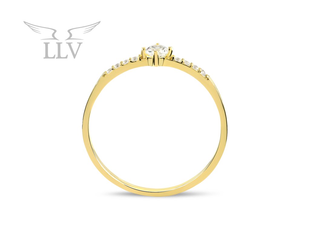 Tento nádherný zásnubní prstýnek ze žlutého 14kt zlata Vás jistě okouzlí nejen svým překrásným designem, ale i svými třpytivými zirkony. Prstýnek zdobí jeden centrální zirkon a osm malých zirkonů, které jsou zasazeny v ramenech prstenu. Zirkony jsou pečlivě usazené v krapnovém osazení tak, aby nedošlo k jejich ztrátě a přesto mohla vyniknout jejich krása a třpyt. Povrch tohoto nádherného prstýnku je hladký v lesklé povrchové úpravě. Skvěle se hodí jako dárek k výročí, může být také něžnou volbou pro zásnuby.