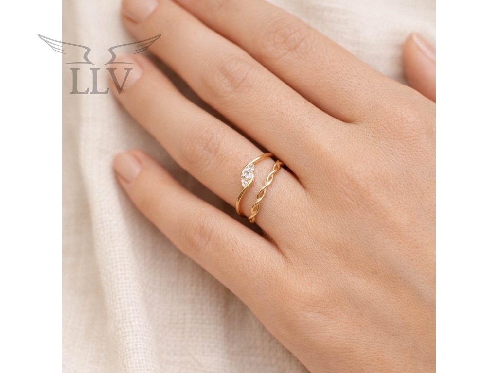 Zlatý prsten ze 14kt zlata zdobený zirkony vyniká svým elegantním, lehce vlnivým designem, který krásně obepíná prst a dodává celému šperku jemnou dynamiku. Středový zirkon září čistým třpytem, zatímco menší kamínky po jeho stranách vytvářejí jemnou světelnou mozaiku.
